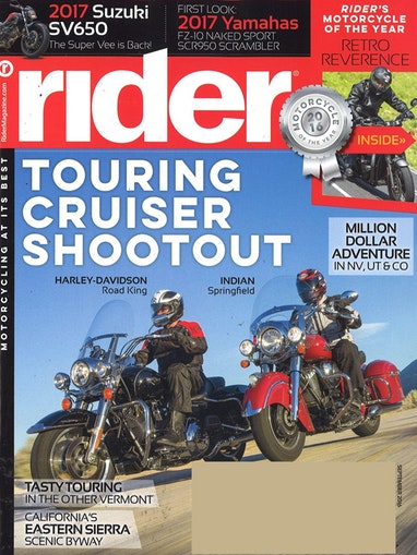 Rider, the premier touring and street-riding magazine, brings you motorcycling at its best! Every issue of Rider is packed with articles about maintaining and improving your machine, extensive road tests, the best places to go and easiest ways to get there. Plus, Rider keeps you up-to-date on the newest models and hottest products in the motorcycle industry. Rider is a must-read for sport, road and touring motorcycle enthusiasts!